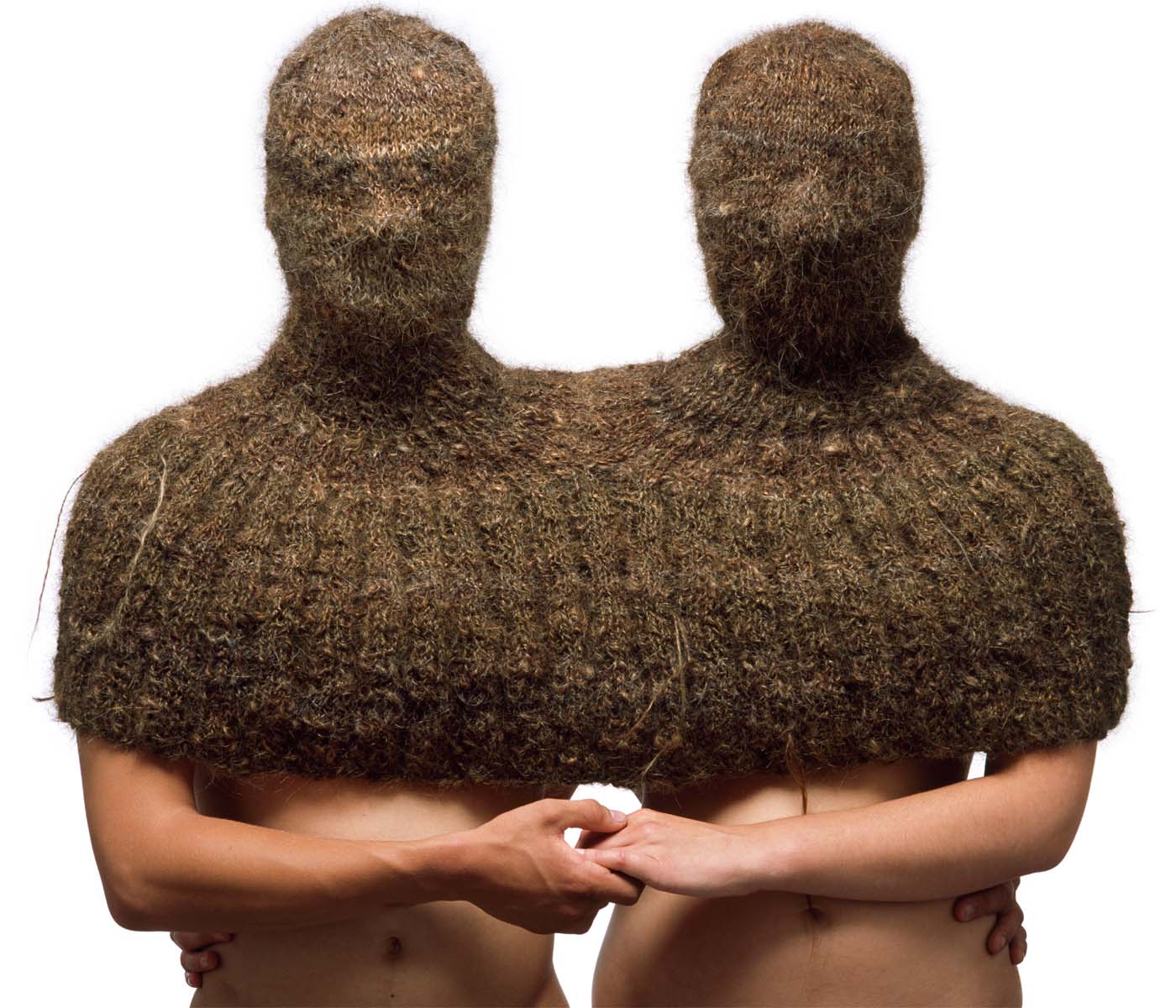 Knitted heads, made of human hair, which are connected as one through the body Models: Mick and Eef